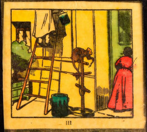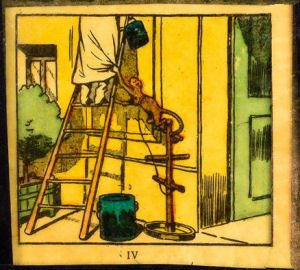 | Le Peintre et le Singe - De schilder en de aap. 12 transparanten van de tekenaar Andre Vallet. De afmetingen van de glasplaten zijn ca 10 x 8 cm en ze zijn gemaakt door de transparante afbeeldingen met tape op het glas te plakken. Gesigneerd linksonder plaatje 12. | ||