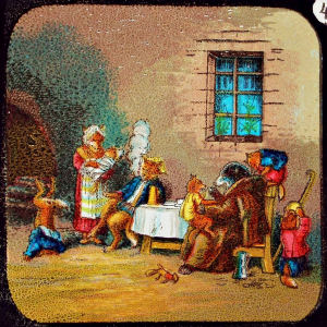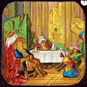 Wishing-Table, the Gold-Ass, and the Cudgel in the Sack 'The Wishing-Table, the Gold-Ass, and the Cudgel in the Sack' is a German fairytale by the Brothers Grimm. The original German name is 'Tischlein deck dich, Goldesel und Knüppel aus dem Sack'. The images on this magic lantern slides were taken from the children's book 'Mein Erstes Märchenbuch', Verlag Wilh. Effenberger, Stuttgart, end of the 19th century. Illustrations by Heinrich Leutemann and Carl Offterdinger. Manufacturer of the slides is Hüttig A.G., Dresden, Germany. The cardboard box at the right comes from the Dutch retailer; it has a label on the cover 'GEKLEURDE LANTAARNPLATEN' (coloured magic lantern slides) and a small label at the side 'No. 30 Tafeltje dek je. (6)'. |