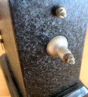 ![]() Sommige speelgoed toverlantaarns waren uitgerust met een ingebouwde fitting voor een gloeilampje. De batterij werd met een tweetal snoertjes aangesloten op twee moertjes aan de achterkant van de lantaarn. |