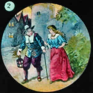 lantaarnplaten in te kleuren. Deze toverlantaarnplaat is een echt kunstwerk. De plaat heeft de Amerikaanse standaardafmetingen, 3.25" x 4" en is met de hand ingekleurd. |