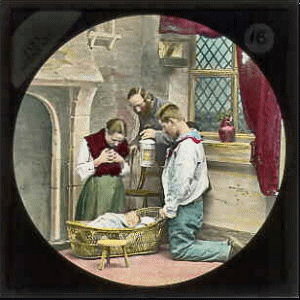 gebruikt op één toverlantaarnplaat.Een bijzonder populaire plaat met een effect was 'De droom van een soldaat': een soldaat ligt te slapen op het slachtveld terwijl boven zijn hoofd steeds wisselende herinneringen aan thuis verschijnen. We onderscheiden een plaat met het tafereel, in dit geval het slagveld met de slapende soldaat, en de plaat met het object dat hier overheen moet worden geprojecteerd, in dit geval de droom: |