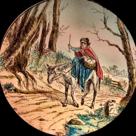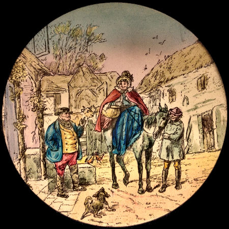 Dame Perkins. This marvellous set of eight magic lantern slide is probably made by York & Son, England, after Lindon Meadows' book 'Dame Perkins and Her Grey Mare Or, the Mount for Market' on the subject of horse racing. |