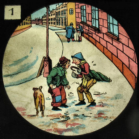 lantern slides showing the story of two boys and their dog: one tripping up a