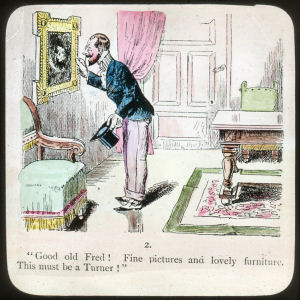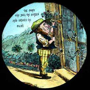 The British workman. Superb set of six slides parodying the work ethic and methods of the British Workman, made by Alfred Pumphrey. |