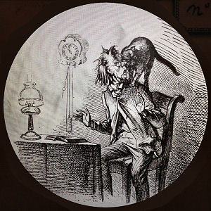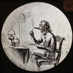 The Alchemist A set of 12 black and white magic lantern slides from an unknown manufacturer and an unknown artist. The title of this set is also uncertain. Size 8 x 8 cm. We probably see here the man who invented the custom of setting off fireworks on New Year's Eve. The clock ticks slowly towards twelve o'clock. Exactly at that moment the man combines a liquid with the oil from his table lamp and.....a huge explosion follows, heralding the start of the new year. The man is saved, but ends up in a sick bed. |