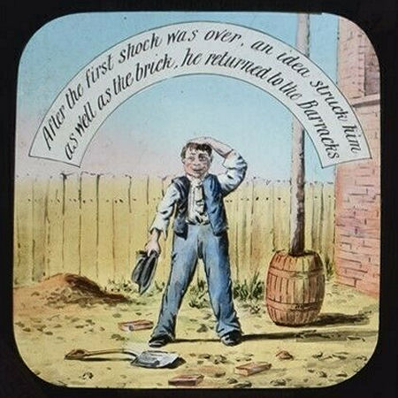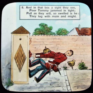 Tommy Atkins and the bees. A set of 12 slides made by the rather unknown manufacturers T.J. and W.F. Piggott, England. Although the images all have a frame containing a short rhyme, each slide has also a title. |
