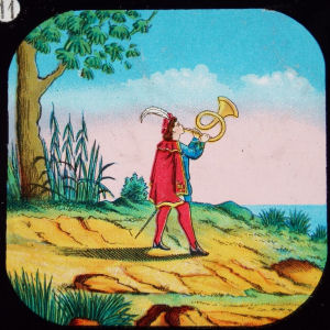 A set of 9 glass slides in a wooden frame made by J. Barnard & Son, London. All slides come with a label stating 'Enamel slides for the magic lantern', the name and address of the manufacturer, the title of the set and a serial number. The part of the story that belongs to the slide is printed on a second label. The wood has 'B&S PATENT' pressed. Dimensions 18 x 10 cm. |
