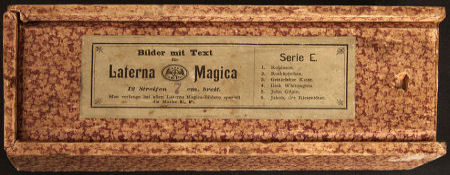 Serie E from 'Bilder mit Text für Laterna Magica' made by Ernst Plank (E.P.). The wooden box contains twelve long magic lantern slides depicting six stories (two slides each story): 1. Robinson; 2. Rothkäpchen; 3. Gestiefelter Kater; 4. Dick Whittington; 5. John Kilpin; and...... Jakob der Riesentödter! |