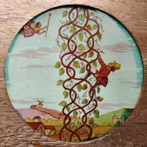 Yet another version of Jack and the Beanstalk A magnificent series of eight hand-painted magic lantern slides in a wooden frame made by an unknown manufacturer. Size: 7 inches x 4 inches; the glass is 3 inches in diameter. |