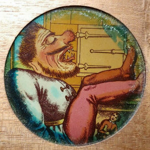 Five hand painted magic lantern slides in a wooden frame depicting the story of 'Jack the Giant Killer'. Frame size is 16.5 cm wide. Manufacturer unknown. |