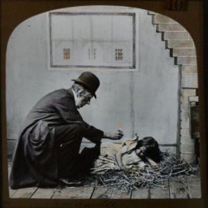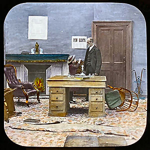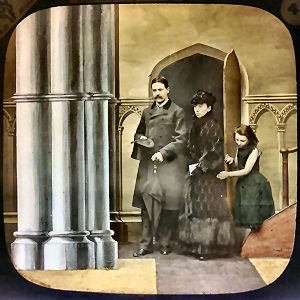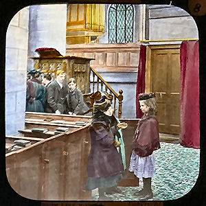 Jessica's Prayer. At last six different versions are known. This one is made by the English manufacturer York & Son, (1884) and consists of maximum 28 slides (10 slides plus 18 hymn slides for use as service of song). |