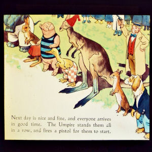 | Strong Tail leest in de krant dat er een wedstrijd hoogspringen wordt gehouden. | Natuurlijk wil hij wel meedoen. | De volgende dag staat hij klaar voor de start. |