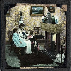 the actors to complete the scene. In particular, organisations like the temperance movement, the Band of Hope and the Salvation Army used the slides extensively to convert a mass audience. The slides were also used in religious services as an illustration for a narrative interlarded with hymns. Often the words of the song would be flashed on the screen so that the audience could join in, accompanied by the harmonium or the piano. The slides were often sold in boxes, along with a booklet from which the story or verse was read aloud. Sets could comprise as many as sixty or as few as two. (pictures: scene from '"Everybody's loved by someone", a set of 12 slides made by Bamforth & Co. Slide is entitled "The Boy was found and taken Home".) |