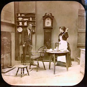 already find the close-up, an effect successfully used in later movies. This kind of slide is mainly produced between the 1870s and the First World War. The heyday of the genre was in the 1880s and 1890s. Later on it declined in popularity and was used mainly in short sets to illustrate popular songs. picture: one of a set of 40 (!) live model slides 'The Musical Miller', made by W.M.S.S.D. (3, Ludgate, Circus Bldgs, E.C.) London, England. |