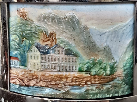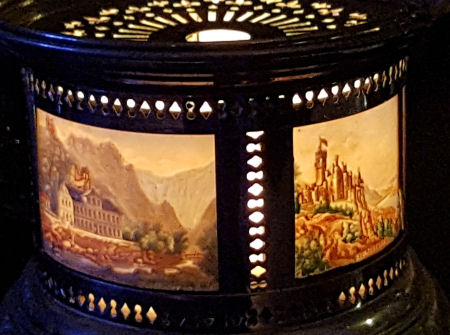 | Rond verchroomd theelicht met petroleumbrander. Daarin vier gebogen landschapslithofanen, allen met de hand ingekleurd. | |
