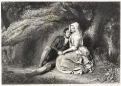Juliette. Perhaps the most famous love story is the story of Romeo and Juliet, shown here in a set of 12 square lantern slides by Theobald & Co., c. 1893. Romeo and Juliet is a classic Shakespearean tragedy about two young lovers from feuding families, the Montagues and the Capulets, who fall in love at first sight in Verona, Italy. They marry secretly with the help of Friar Laurence, but a series of escalating conflicts, including the death of Juliet's cousin Tybalt and Romeo's banishment, leads to their tragic deaths. Romeo, believing Juliet to be dead, drinks poison. When she awakens to find him dead, Juliet stabs herself, thus finally ending the long-standing feud between the families. |