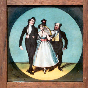 Rivals in love. Two square hand painted magic lantern slides in a wooden frame depicting two suitors offering their arms to a lady. The lady chooses and walks away with one of the men. Anger and grief for the other one. Manufacturer unknown. There seems to be an unreadable signature in a corner of the second slide. |
