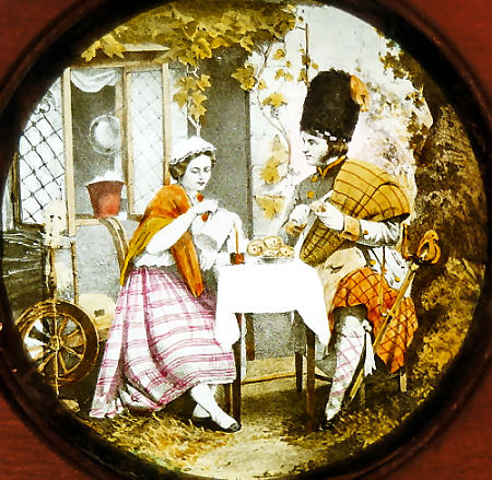 ![]() Cottar's Saturday Night. Great magic lantern slide made by T.H. McAllister N.Y. after the poem 'The Cotter's Saturday Night' by Robert Bur (1759–1796) and an illustration by John Faed. ![]() On the side of the wooden frame is a (damaged) glued label with the title of the slide and a strophe of the poem "Cottar's Saturday Night" "Tis when a youthful loving modest pair, In others arms breathe out the tender tale." |