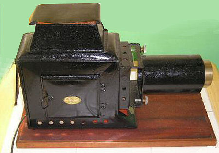 ![]() Deze relatief eenvoudige toverlantaarn van Newton is gemaakt van mahoniehout en metaal en is 45 cm hoog. Op de voorzijde is een ivoren plaatje met de naam en het adres van de fabrikant aangebracht; op de ingebouwde kerosinelamp met drie pitten is een messing merkplaat aangebracht. Uitgerust met een tandheugelwiel voor het scherpstellen van de projectielens. De lantaarn stamt uit het eind van de 19e eeuw. |