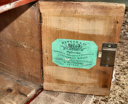 ![]() De lantaarn is voorzien van een messing merkplaatje van Newton & Co. Op de binnenkant van de deur van de houten kist bevindt zich het originele groene etiket. |