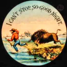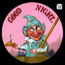 1. Unashamed yawning girl with a candle saying GOOD NIGHT inside a floral wreath. Slipping slide. The wooden frame measures 7 x 4 x 3/8 inches. 2-5. Advertising slides from Cadbury's Cocoa. 8. A severe looking schoolmaster with a cane. His eyes move in a frightening way from side to side and he has the word SILENCE below him. This slipping slide is the one the lanternist would have used when he completely lost his temper with the kids (7 x 4 inches). 9. The last one of a lovely set of twelve slides about Punch and Judy (3.25 x 3.25 inches). |