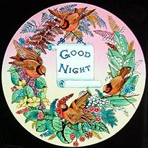 and unrolling a scroll with a 'good-night' message, thus unveiling his sturdy calves again and again. 7. Handpainted slide which the projectionist would have used to start his magic lantern show. It is encased in a mahogany frame. ![]() |
