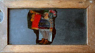 ![]() (above) Single slipping glass mechanical magic lantern slide depicting a conductor who beats the time by moving his arm and leg. Measures c. 18 x 10 cm. (right) Superb hand-painted lever action Magic Lantern slide in mahogany frame showing a man sitting on a wall playing a mandolin with Venice in the background. Size : about 7 inches x 4 inches. Moving the lever makes the man strum the mandolin. (picture not animated) |