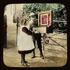 ![]() Christies Old Organ. Three beautiful slides from a series of 28 square 'Life Model slides'. It tells the sad story of a young boy who comes across the old organ grinder Old Treffy who is ill and chilled with the cold. He takes the organ from him to earn some money for the poor man. He meets a girl called Mabel who becomes his friend. Having earned enough money they bring a doctor to see Old Treffy but it's too late; the old man dies. See: Christie's old Organ. Some Life Model slide sets after the book of Mrs O.F. Walton. |