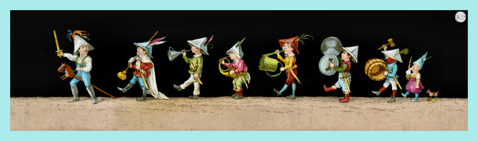![]() Long magic lantern slide depicting some travelling musicians. |