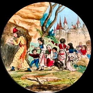 ![]() Beautiful hand painted magic lantern slide titled "Grandmother's Dancing Lesson". Measures 3 1/4 by 4 inches (8.2 x 4 cm). Not any musical instrument to be seen on this slide but when you look at the picture you actually hear the matching music play. (I hear one of Mozarts Minuets when looking at this picture) |