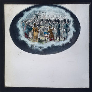 The Soldier's Dream A beautiful set of effect slides. The complete set consists of 6 square magic lantern slides, 8 x 8 cm. Displaying this set required at least two magic lanterns, or a biunial (a double magic lantern). One lantern projected the picture with the soldier, the second the other pictures in order. The lanterns had to be adjusted in such a way that together they projected one image on the screen. When three lanterns were used, the scenes could also dissolve into each other. |