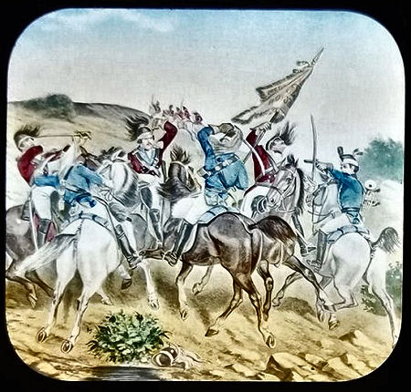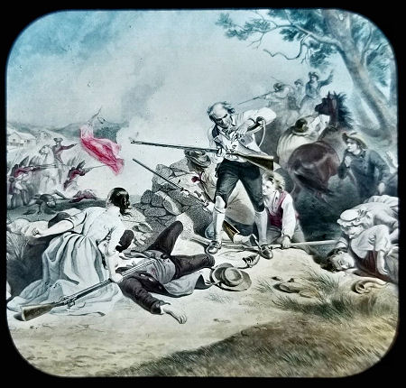 | Four coloured glass magic lantern slides showing scenes from famous American battles. Size: 3.25" x 4". | |
