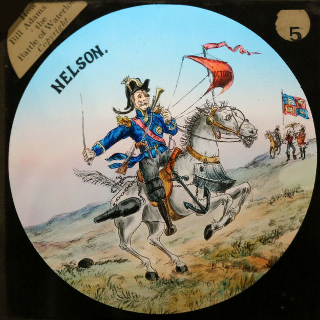 How Bill Adams won the BATTLE of WATERLOO A nice set of 13 magic lantern slides made by an unknown manufacturer. |