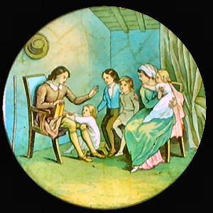 The Pilgrim's Progress - Barnard. Barnard & Sons used the same images for a set of twelve circular slides mounted in a wooden frame. All slides wear a label with the name of the manufacturer and the title of the set. They are 7 x 3 inches in size ( 18 x 7,6 cm). |
