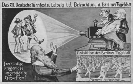 Postcard, unknown origin. The 12th Deutsche Turnfest zu Leibzig took place in 1913. Apparently the editors of the Berliner Tageblatt described the situation differently than it really was. 'Frechlustige kragenlose ungebügelte Gesellen!' (Naughty, collarless, unbridled companions). |