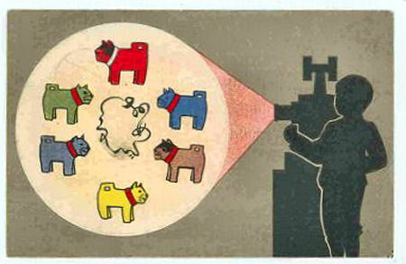 ![]() Vintage postcard, Japanese art, c. early 1900's. A child using a magic lantern to project pictures of dogs at the wall. Art Deco style? |