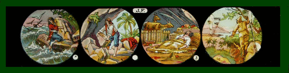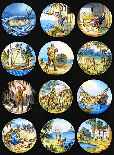 part 1 Only a few other books are published in so many versions of magic lantern slides as Daniel Defoe's famous novel Robinson Crusoe (1719). |