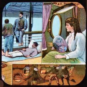 Ocean Palace. Set of twelve square magic lantern slides made by Theobald & Co. England. Images based on work of William Whitelock Lloyd, P. & O. pencillings: sketches on board a steamer. All slides are marked: 'P & O Pencillings' at the bottom of the images. Continued from 'The overland route to India' (see above). |