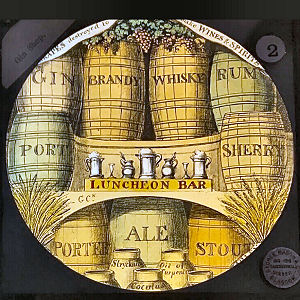 The Gin Shop A set of twelve beautiful magic lantern slides made by York & Son, around 1885. The images are made by the famous artist George Cruikshank who also made the images for 'The Bottle'. 'The Gin Shop' is a poem by an anonymous poet. |