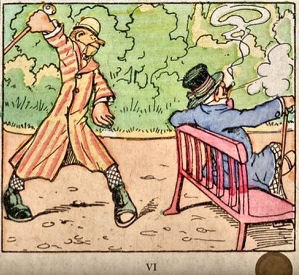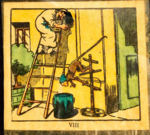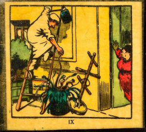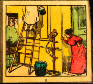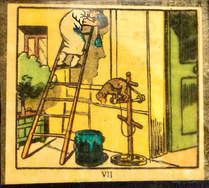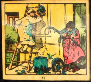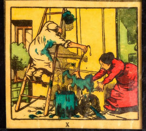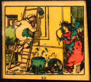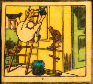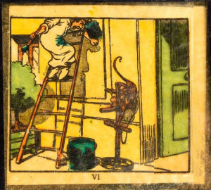 | Le Peintre et le Singe - The painter and the monkey. 12 transparencies by the artist Andre Vallet. The glass slides are roughly 10 x 8 cm and made by attaching artwork on rice paper to the glass slide with tape. Signed lower left picture 12. | ||