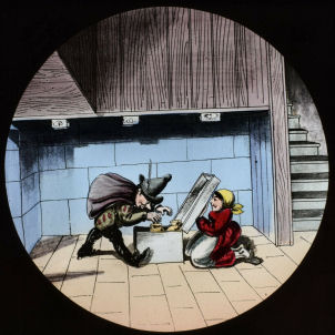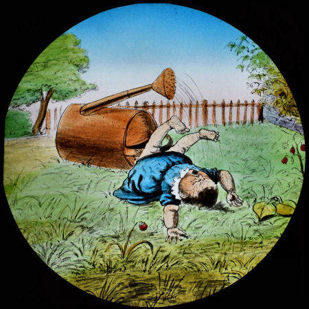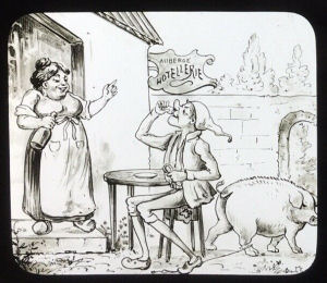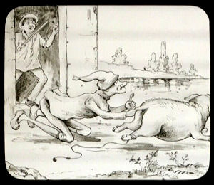 ![]() In the original story, the farmer gets beaten at the end. In this magic lantern version, that's the pig. |