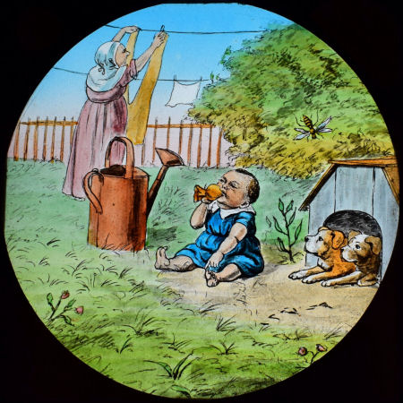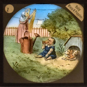 the Puppies Zweites Buch, Der Schnuller (387) 1865. The battle between a baby with a suction cup, two puppies and a wasp. The images are based on Busch's series, but were redrawn for this series of magic lantern slides. The manufacturer is unknown and no titles of the individual slides are known. There is another set, which was created by Walter Tyler. |