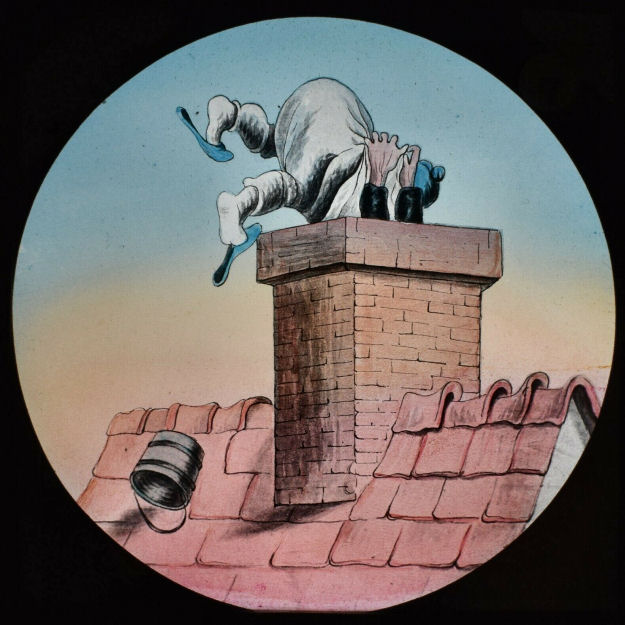 | 4. The miller, unable to hide, gets a hiding. | 5. The sweep has to retreat up the chimney. | 6. The miller, who cannot follow him, tries to wash him out of it. |