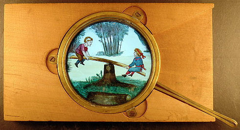 The name of the maker is pressed in the wooden frame.![]() The disk has six slots containing individual scenes of a skeleton. As you rotate the disk the skeleton appears to dance. |