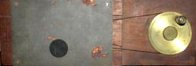 This nice mechanical magic lantern slide measures 4” by 7” with a 3” diameter 2-layer glass centre. Moving one of the glasses by moving the lever up and down, brings the image to live. This slide has no manufacturers name on it but is marked on the wood frame 'Patd June 17, 1890'. |