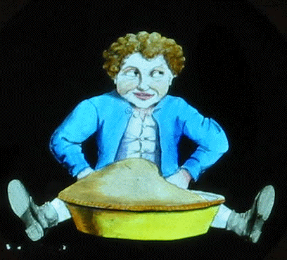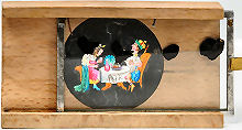 ![]() Hand painted slipping slide. When the glass is first operated the boys eyes move from side to side. When the glass is fully operated we see the boy putting his finger in the pie. The mahogany frame measures 7" x 4" (18 x 10 cm). |