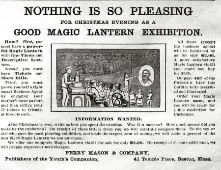 ![]() De uitgever van het Amerikaanse tijdschrift The Youth's Companion was waarschijnlijk de eerste die effectief gebruik maakte van z.g. weggevertjes, gratis of erg goedkope artikelen, voor hun jaarabonnees. Deze 'premies' werden gegeven aan nieuwe abonnees, maar ook aan bestaande abonnees die hun jaarlijkse abonnement verlengden. Abonnees konden ook een groot aantal aantrekkelijke artikelen voor weinig geld kopen: het 'Premium List Number' van het tijdschrift bevatte een grote hoeveelheid afbeeldingen en beschrijvingen van onder andere, zakmessen, camera's, boeken, goocheltrucs, stoommachines, microscopen en opbergzakjes voor horloges. Een van de meest aantrekkelijke aanbiedingen was natuurlijk....... een echte toverlantaarn! In de jaren 1890 kregen abonnees die twee nieuwe abonnees aanbrachten, de lantaarn toegestuurd tegen betaling van 45 (dollar)cent voor porto en verpakking. |