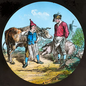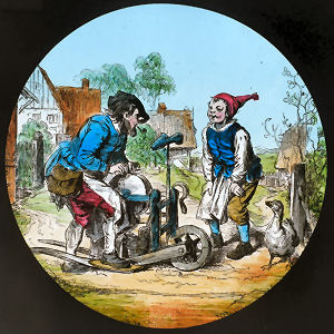 Ezeltje-strek-je en de Knuppel-in-de-zak. 'Tafeltje-dek-je, Ezeltje-strek-je en de Knuppel-in-de-zak' is een Duits sprookje van de Gebroeders Grimm. De oorspronkelijke Duitse naam van het sprookje is 'Tischlein deck dich, Goldesel und Knüppel aus dem Sack'. De afbeeldingen op deze toverlantaarnplaten werden overgenomen uit het kinderboek 'Mein Erstes Märchenbuch', Verlag Wilh. Effenberger, Stuttgart, eind van de 19e eeuw. Illustraties van Heinrich Leutemann en Carl Offterdinger. De fabrikant van de platen is Hüttig A.G., Dresden, Duitsland. Rechts: Kartonnen doosje van de Nederlandse doorverkoper met etiket 'GEKLEURDE LANTAARNPLATEN'. Klein etiket op de zijkant: 'No. 30 Tafeltje dek je. (6)'. |