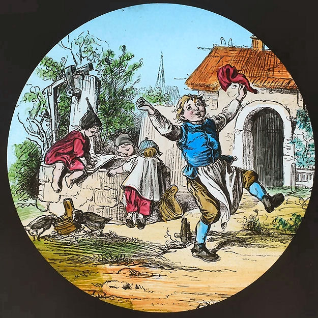 Tapferes Schneiderlein - Het dappere snijdertje. Andere Nederlandse titels: "Het dappere kleermakertje" en "Zeven in één klap". Nog zo'n sprookje van de Duitse Brothers Grimm, sprookje nummer KHM 20. De oorspronkelijke Duitse naam is 'Tapferes Schneiderlein'. De afbeeldingen op deze toverlantaarnplaten werden waarschijnlijk ook overgenomen uit het kinderboek 'Mein Erstes Märchenbuch', Verlag Wilh. Effenberger, Stuttgart, eind van de 19e eeuw. Illustraties van Heinrich Leutemann en Carl Offterdinger. De fabrikant van deze platen is Hüttig A.G., Dresden, Duitsland, serial# . |