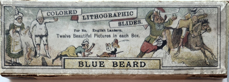 BLUEBEARD (Blauwbaard) Doosje en één lantaarnplaat uit een serie van 12 platen die het verhaal vertellen van Blauwbaard. Het etiket op het doosje beschrijft de titels van de platen en het verhaal. |